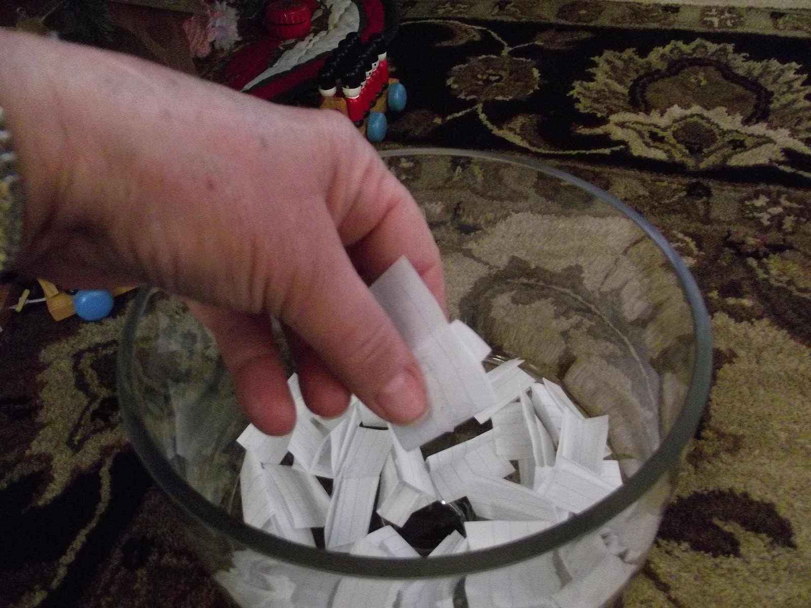 There are 77 names in the bowl.  57 are followers of the blog with an additional 20 names of  people who left comments.  The first winner is: